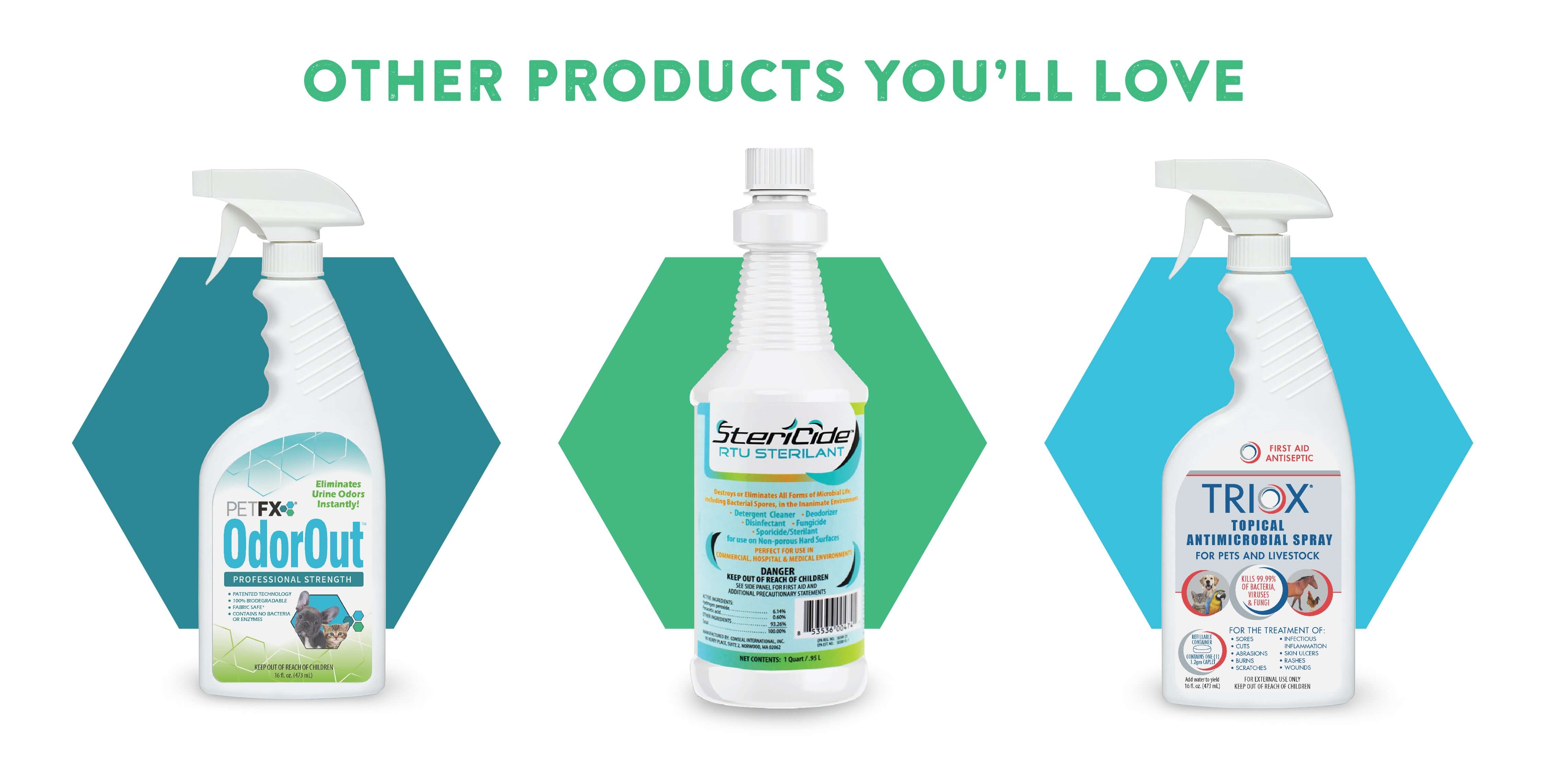 Treat your pets and livestock with the best first aid antiseptic. Triox® kills 99.99% of bacteria, viruses, & fungi.